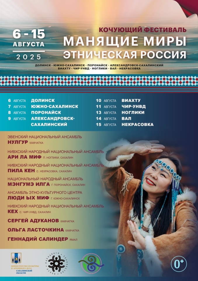 С 6 по 15 августа Сахалинская область примет XX Юбилейный Кочующий фестиваль «Манящие миры. Этническая Россия». Этот уникальный передвижной культурный проект, охватывающий различные города и села страны, предложит гостям знакомство с богатым наследием коренных малочисленных народов России.