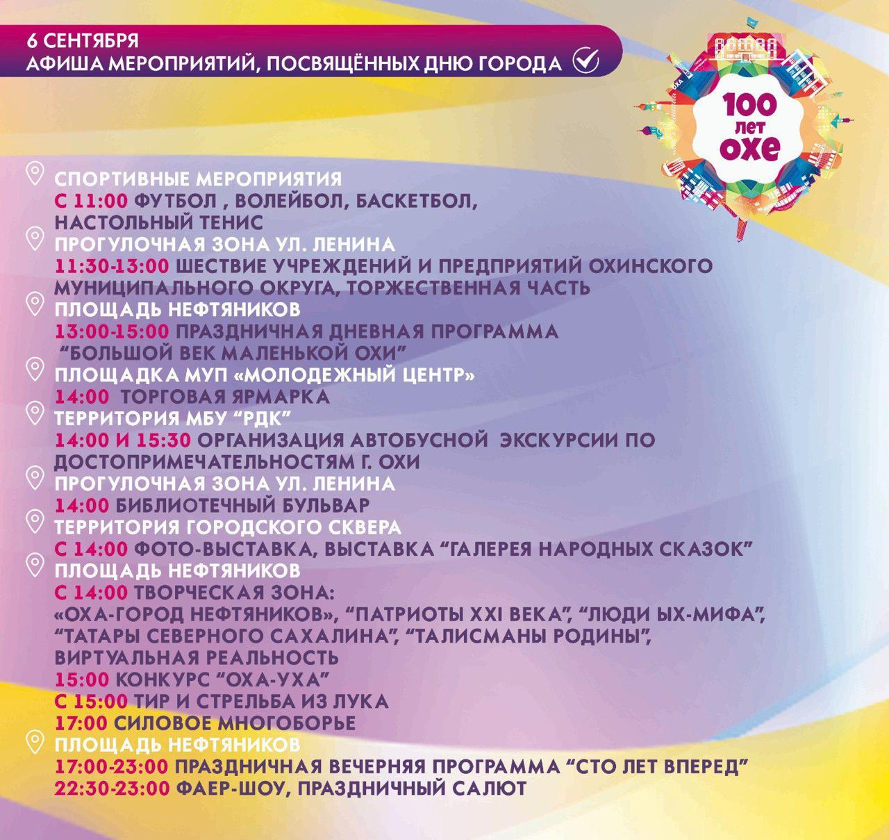Перечисленное – лишь малая часть юбилейной программы. В течение дня в Охе будут проходить праздничные спортивные соревнования, в центре города развернутся на выбор десятки локаций. Возле Молодежного центра состоится благотворительная ярмарка движения «Оха – фронту», все средства с которой традиционно будут направлены на первоочередные нужды наших ребят на передовой. С территории Дворца культуры дважды отправятся по маршруту уже полюбившиеся горожанам и гостям города экскурсионные автобусы. Вдоль прогулочной зоны на улице Ленина будет работать «Библиотечный бульвар». На территории сквера вниманию гостей праздника будет представлена тематическая фотовыставка и экспозиция «Галерея народных сказок».