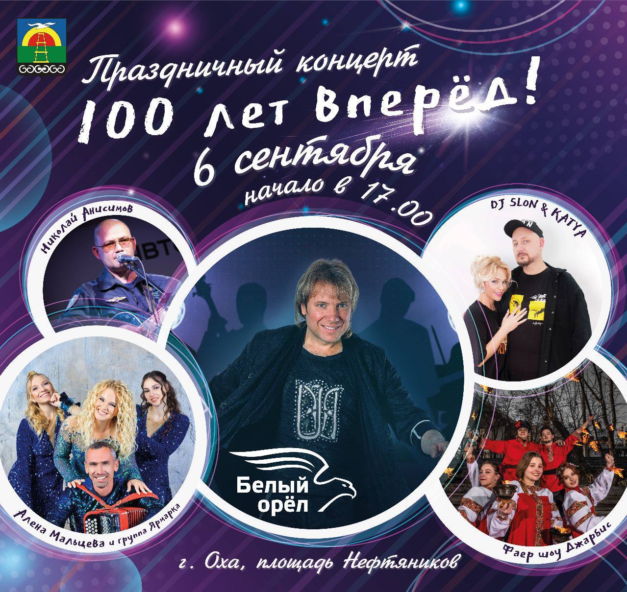 Вечерняя концертная программа порадует горожан номерами местных исполнителей – Татьяны Слинеук, Зинаиды Мелиховой, Ирины Свиридовой и приезжих коллективов. В этот раз гостей будет много. Охинцы услышат вокальные композиции в исполнении шоу-группы «Ярмарка» из Санкт-Петербурга и белорусского автора-исполнителя песен об авиации, телеведущего Николая Анисимова. Впервые на сцене нашего маленького северного города выступит группа «Белый орел» из Москвы. Помните песню «Как упоительны в России вечера»? Она тоже обязательно прозвучит. Также охинцев поздравят DJ Slon & Katya. Ведущими вечера станут Виктория Байрак и DJ радио «Шансон» Владимир Цветков.