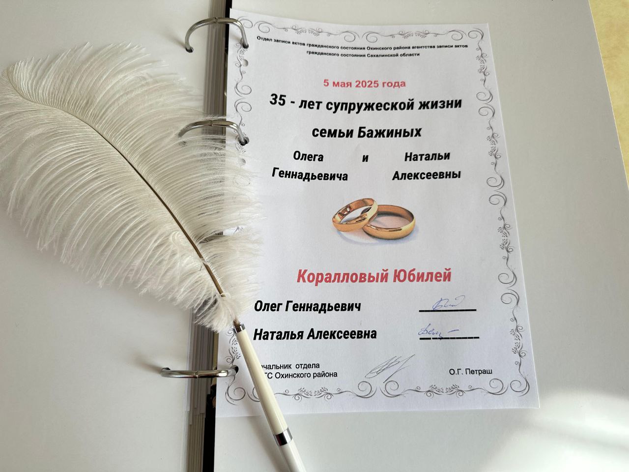 В день юбилея свои двери перед супругами торжественно распахнул отдел ЗАГС Охинского района. В честь коралловой свадьбы имена «молодоженов» были занесены в Книгу почетных юбиляров Охинского района, жениху и невесте вручили свидетельство «О коралловом юбилее» и памятный Поздравительный адрес от Агентства ЗАГС Сахалинской области.