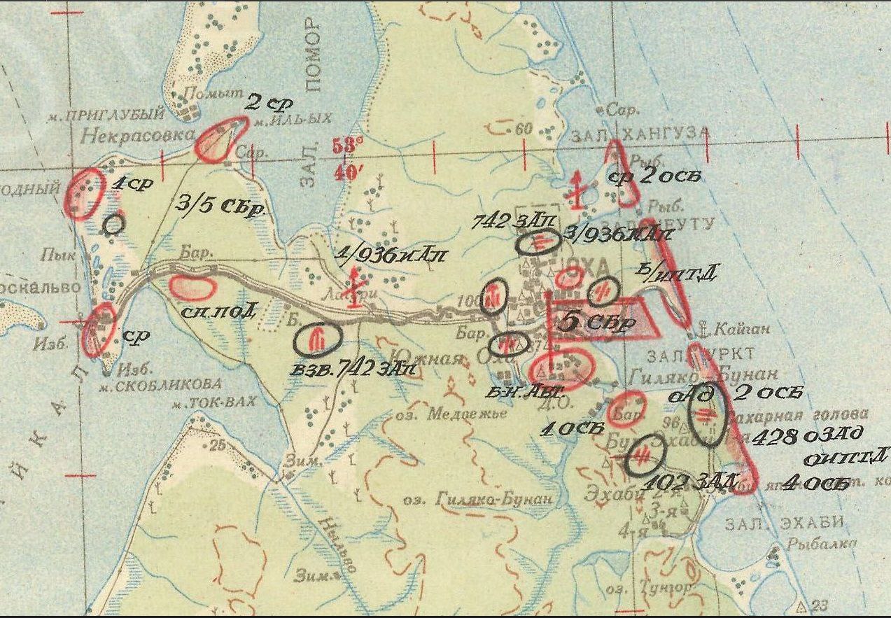 Карта расположения в Охинском районе воинских частей на 1943 — 1944 гг.