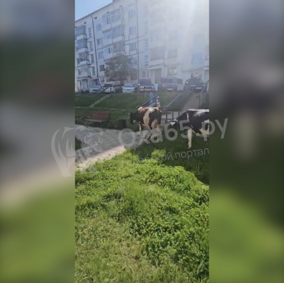 Во дворе домов № 26 и № 28 по улице Дзержинского в Охе развернулась почти идиллическая картина: дети играют на площадке, а буквально в нескольких метрах от них пасутся коровы. Видео с этой живописной, но не совсем безопасной сценой прислал соавтор портала Оха65.ру.